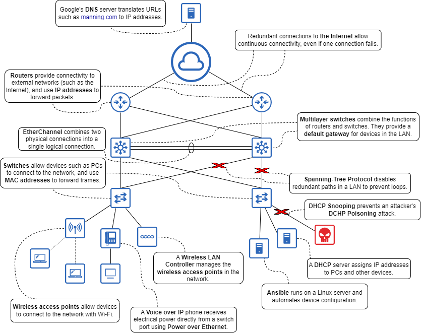 A Local Area Network (LAN) connected to the Internet (as represented by the cloud icon). Various devices (routers, switches, etc.) and protocols (DHCP, DNS, etc.) are highlighted. We will cover all of these technologies and more in this book.