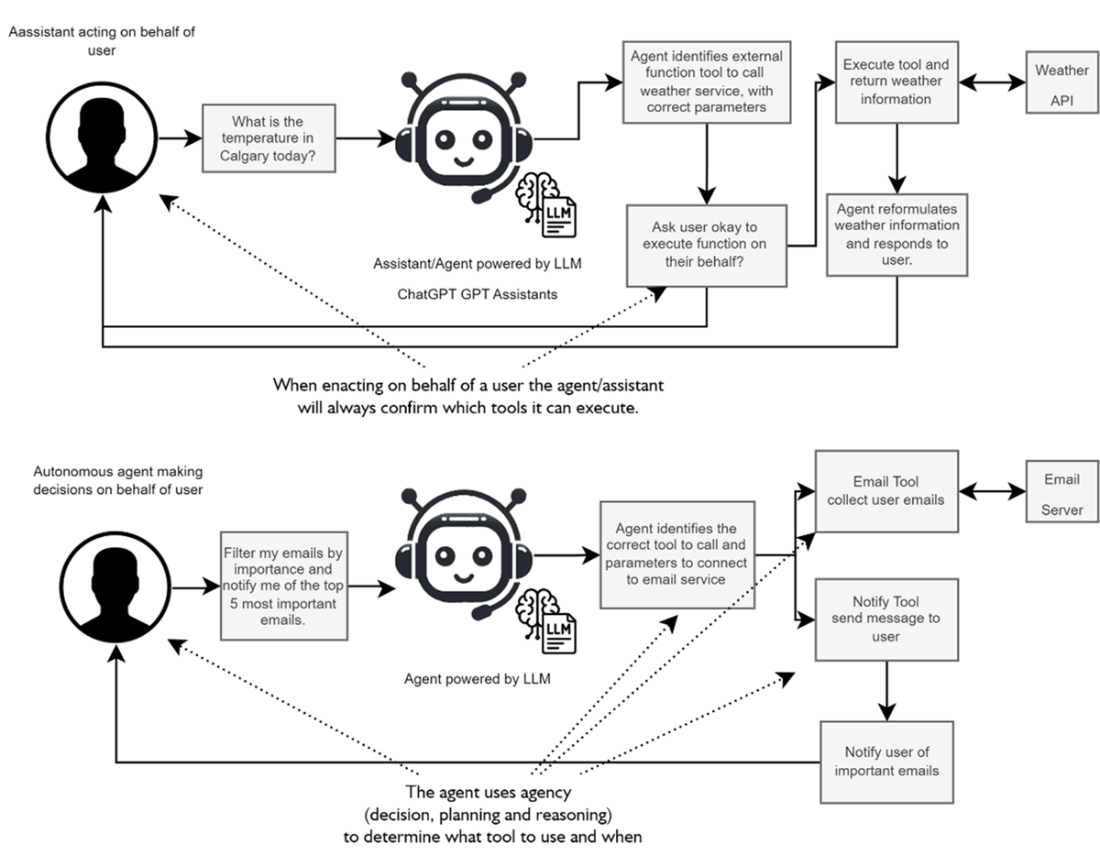 Top: an assistant performs a single or multiple tasks on behalf of a user, where each task requires approval by the user. Bottom: An agent may use multiple tools autonomously without human approval to complete a goal,