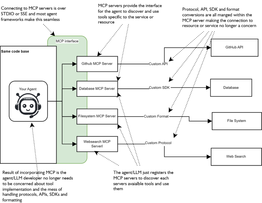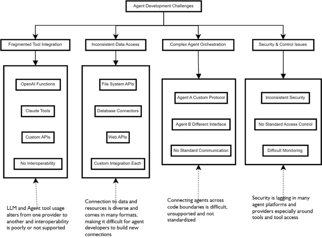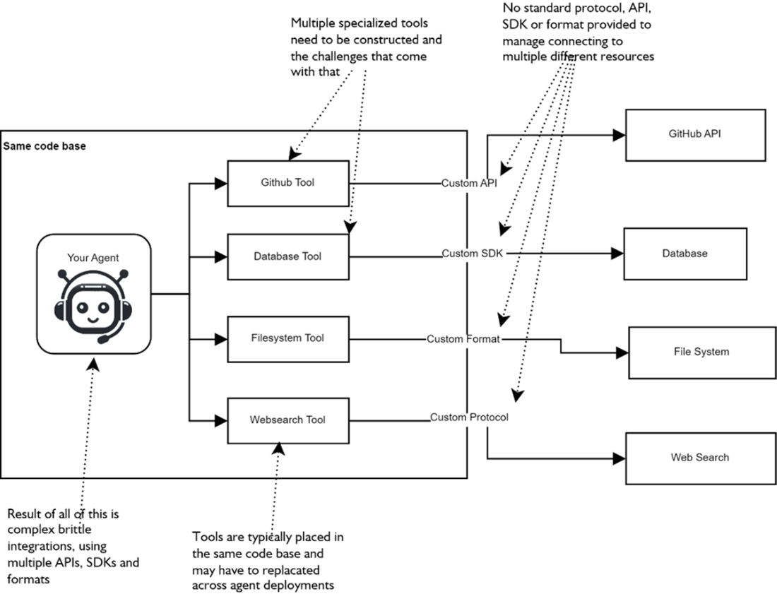A typical problem agent/LLM developers face when connecting to multiple services and resources is the lack of standardized connections and the need to support multiple different connectors to whatever services they need access to.