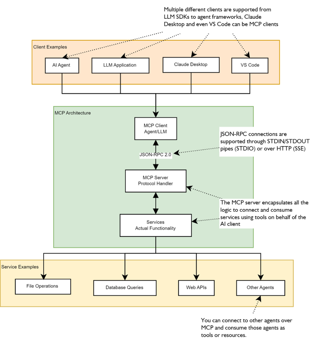 - MCP Architecture is in 3 parts: MCP Client, Server, and the Service/Resource it fronts. An agent is just one kind of client.