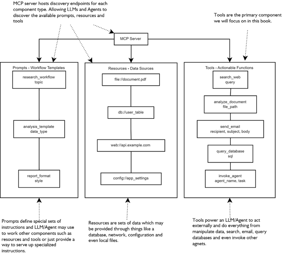 - MCP supports three components: Tools (actions), Resources (data/objects), and Prompts (re-usable templates). Agents can treat any of them as callable verbs.