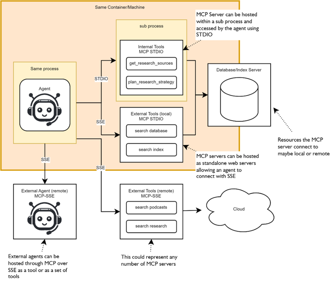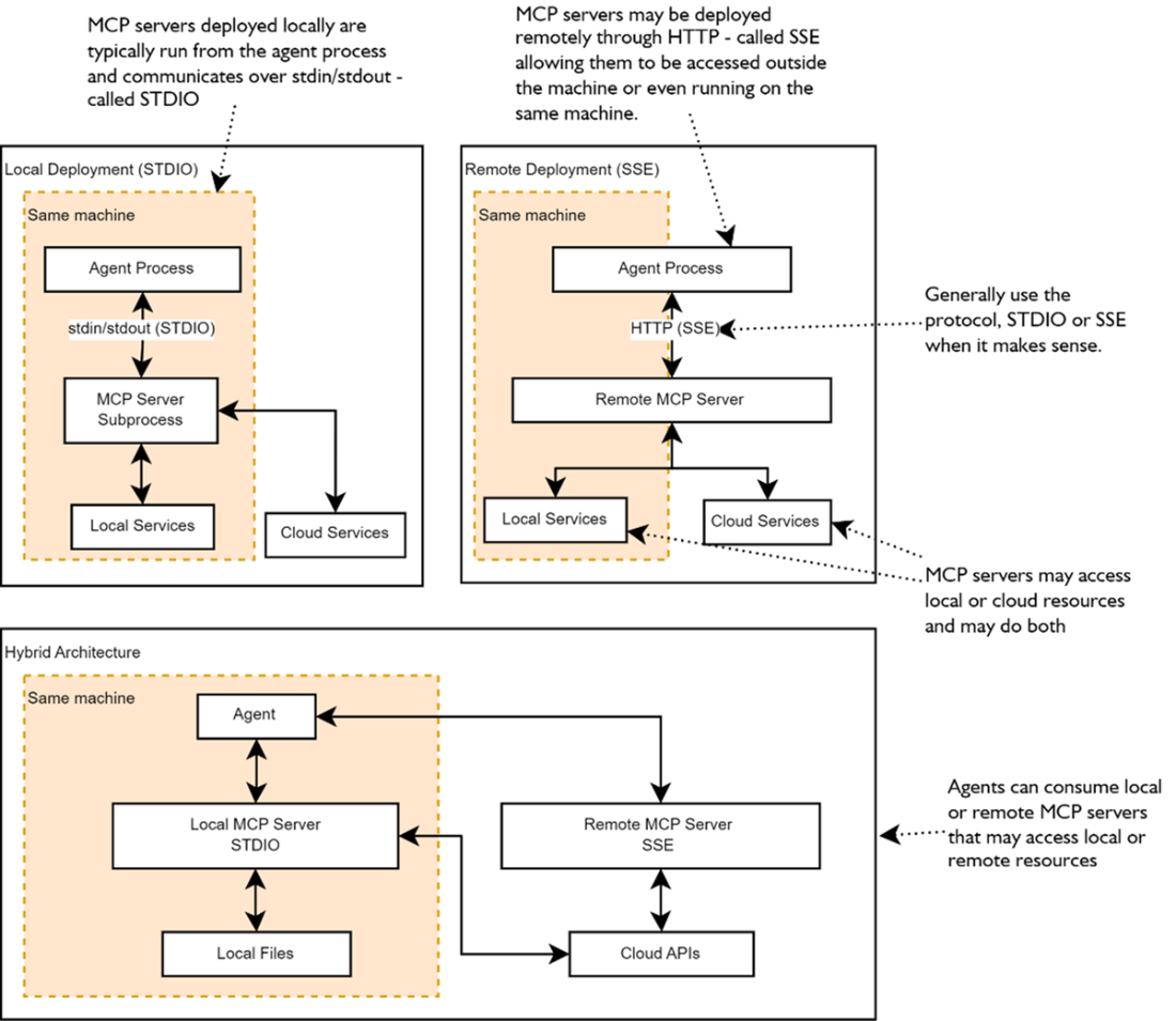 The various deployment patterns that may be used to connect MCP servers to agents. From running locally and within a child process on the same machine, running remotely and accessible over HTTP to include hybrid architectures that blend local and remote MCP servers to single agent.