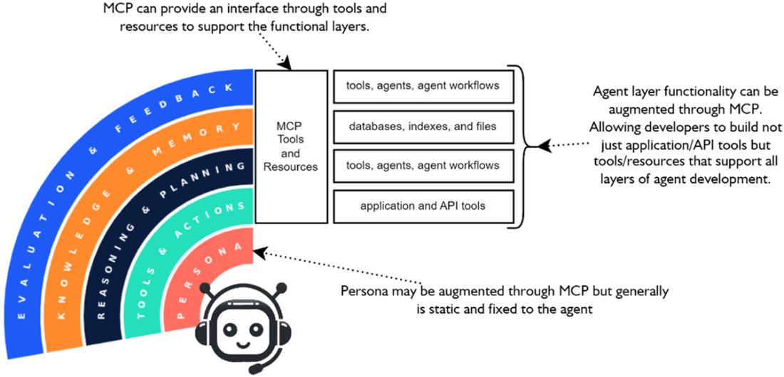 - MCP is not just for tools/actions but can support the other functional layers (Reasoning & Planning, Knowledge & Memory, Evaluation & Feedback)