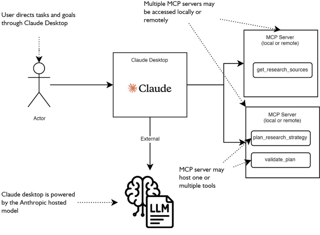 Claude desktop may consume multiple MCP servers deployed locally or remotely. The LLM that powers Claude then uses the MCP components (generally tools) to enhance its capabilities.