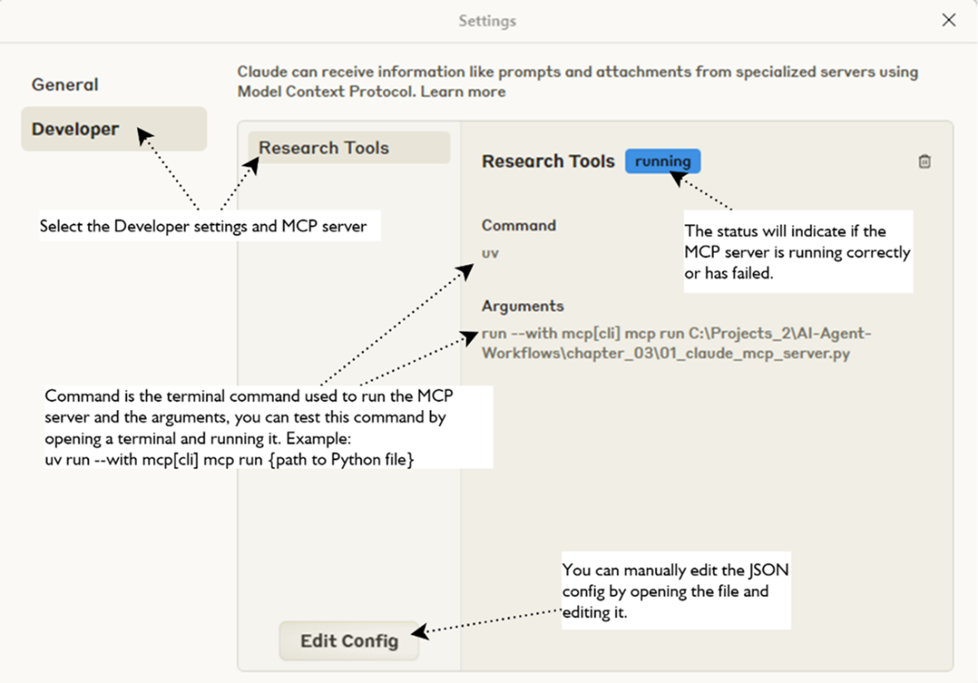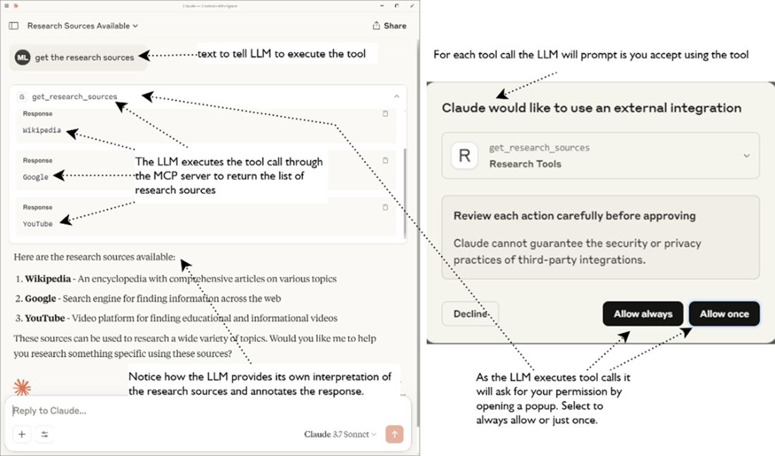 mcp install your_server.pyand enable it in Settings → Developer. - In assistants like Claude Desktop, tool execution requires human approval.