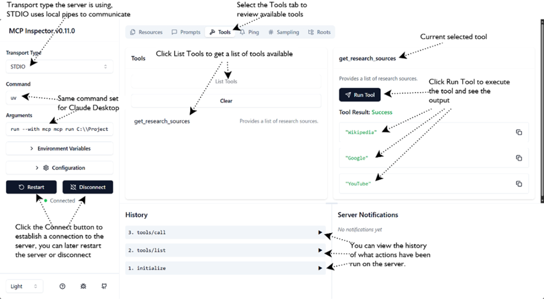 - The MCP Inspector gives a live, clickable view of any server—perfect for debugging tool schemas and outputs before wiring agents to them.