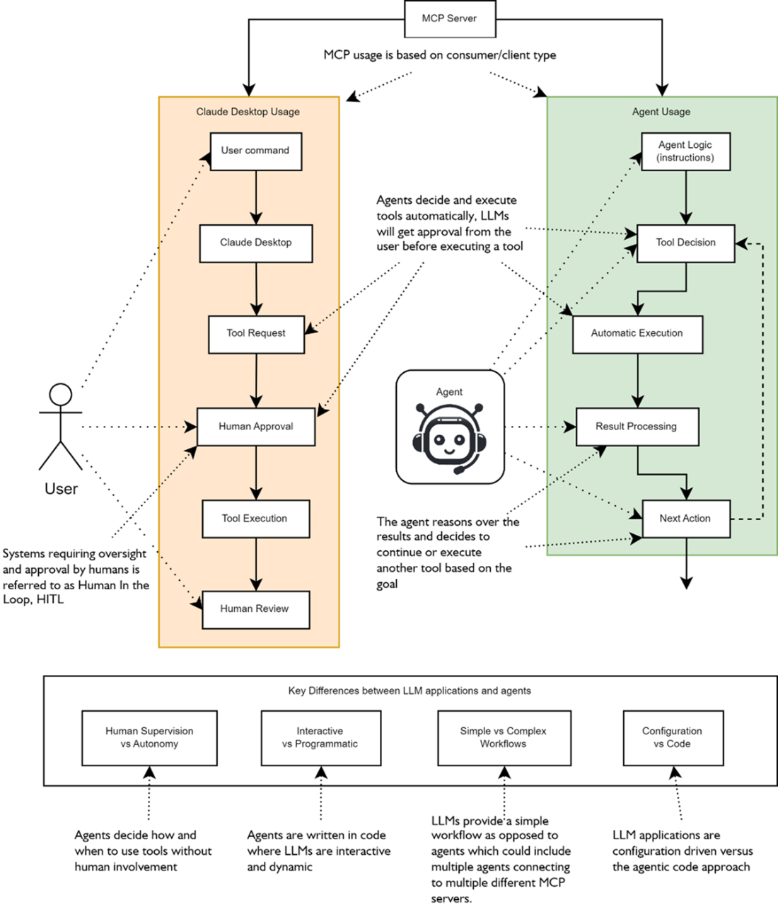 The key differences between MCP tool execution from an LLM application (Claude Desktop) or through using an agent include; assistants require human supervision while agents are autonomous, assistants are interactive to agents programmatic, agents perform more complex multi-step workflows and assistants typically are limited to performing simple plans.