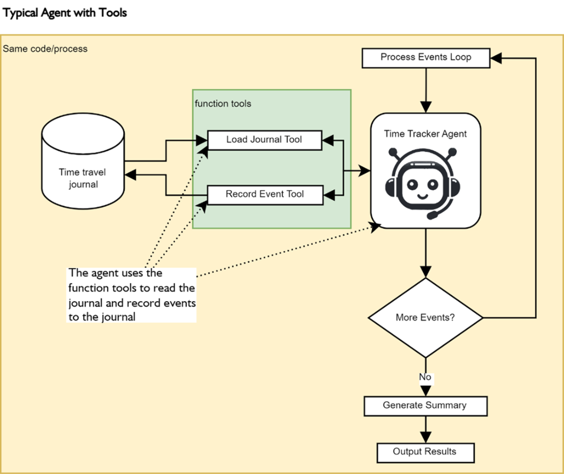 The time tracker agent will record time events using internal function tools as it processes the events in a loop. After the loop finishes the agent is asked to summarize the events and it will use the Load Journal Evants tool to load the journal of events and summarize