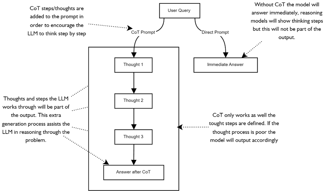 - Chain-of-Thought (CoT) prompting turns a model’s hidden intuition into explicit, step-by-step thoughts that are easy to debug, at the cost of extra tokens and latency.