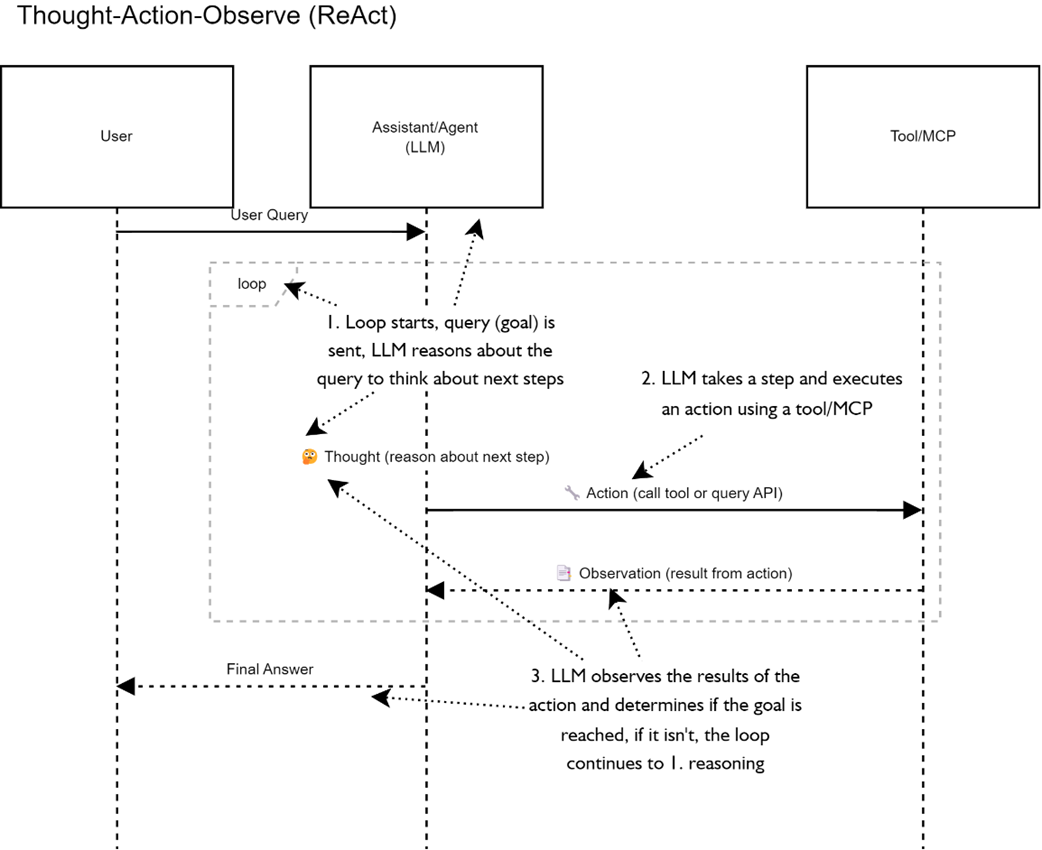 - ReAct augments CoT with tool calls: Reason → Act → Observe → Repeat, letting an agent gather information dynamically while iteratively refining its plan.