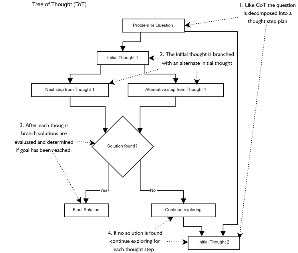 shows a partial workflow of the tree of thought process where thoughts are branched into nodes and each node is executed to determine which is the best path to follow.
