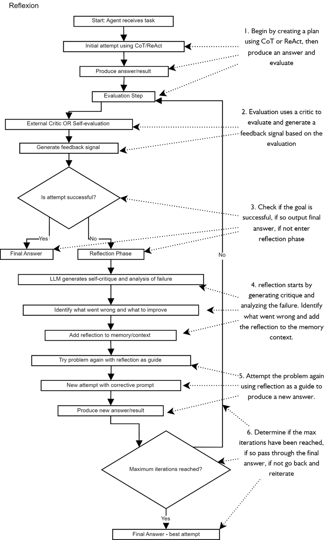 - Reflexion wraps a solver–critic loop around any reasoning strategy: the critic provides feedback, the solver revises, and the cycle repeats until the answer passes a self-defined check.