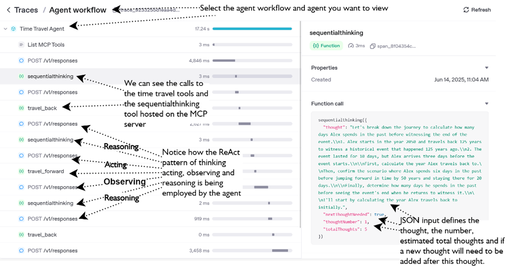 shows the Traces page for the Time Travel Agent execution, from here we can see how the agent goes through the ReAct pattern of reasoning, acting, observing and reasoning again.