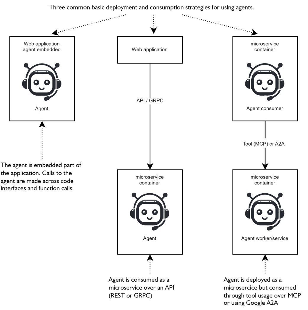 shows three simple patterns for deploying and consuming agents. From embedded agents, a microservice API is accessible or used as a tool through other agents.