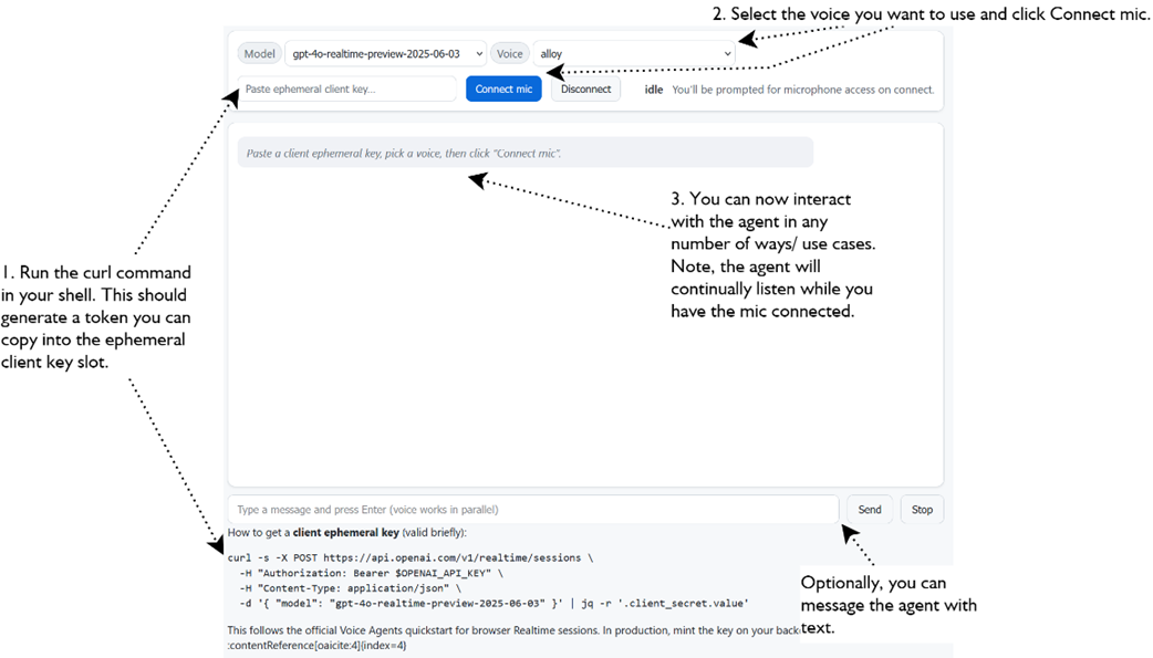 Connecting to a real-time model using a RealTime Agent object in a web browser. Allows for vocal interaction with the agent hosted in the browser.