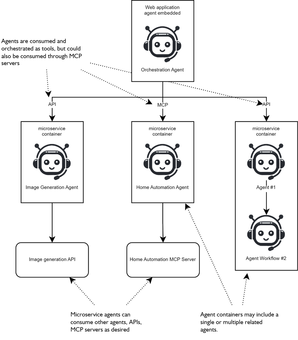 - Containerized microservice as a tool (API/MCP/A2A): Self‑contained agents consumed by other agents or apps. Ideal for scaling, swapping, and isolating long or heavy tasks. No built‑in UI.
