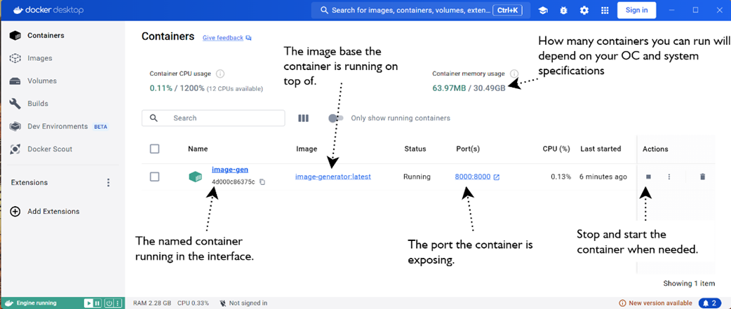 docker run -p 8000:8000 -e OPENAI_API_KEY=... - Use Docker Desktop to view logs, start/stop containers, and manage versions.