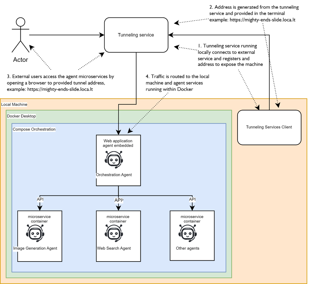 illustrates how external tunneling options can expose locally running agent services to external users. The Actor represents an external network user accessing an agent service. First the user browses to the tunneling service address and then routed to the a developers local machine.