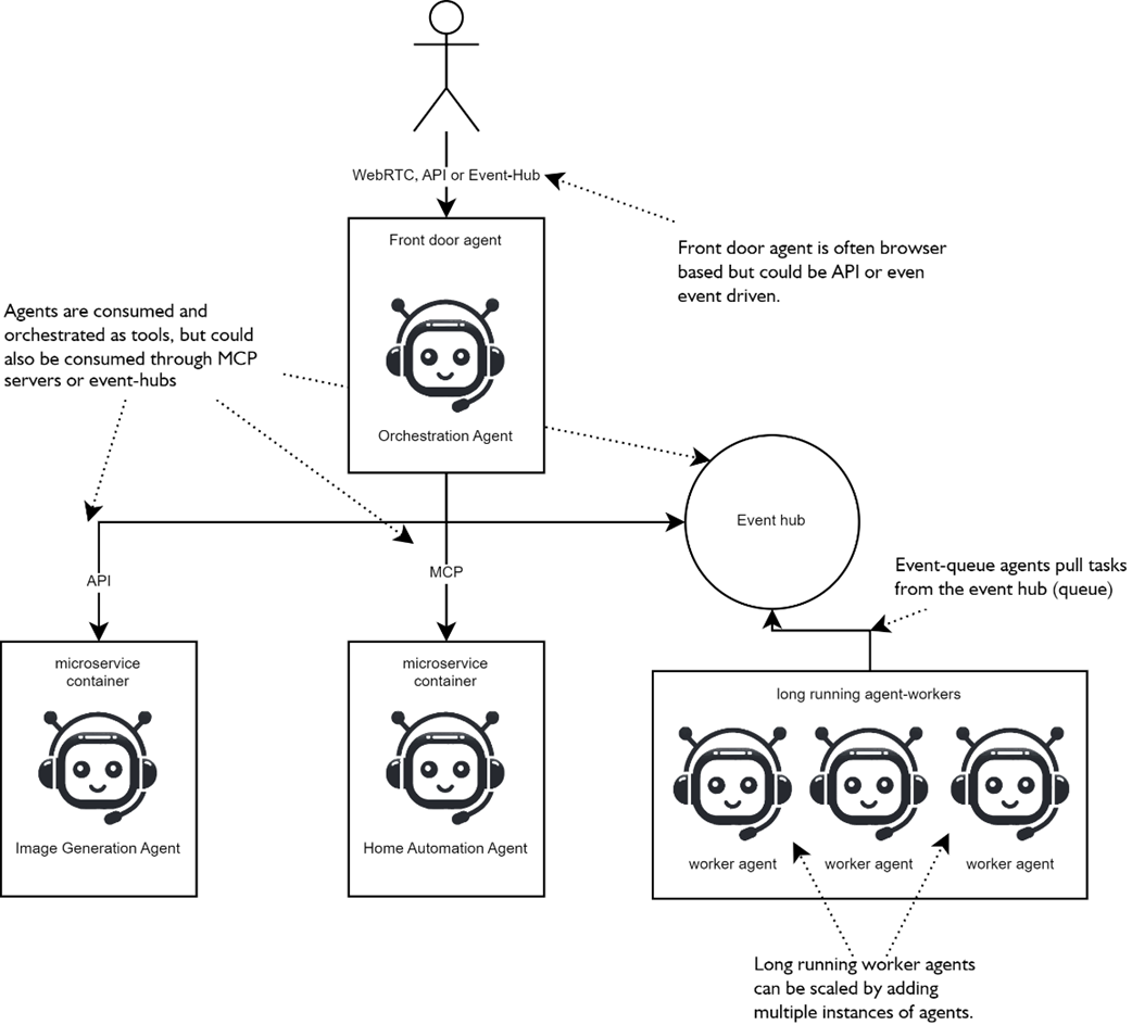 - Front‑door/orchestrator patterns route user intents to specialized worker agents; keep the front‑door light and push complexity into typed, well‑scoped workers.