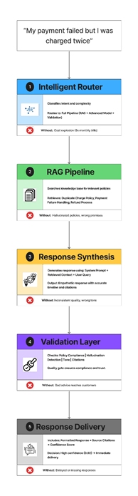 - Behind successful interactions lies invisible infrastructure - Sarah's two-minute payment resolution required routing, knowledge retrieval, synthesis guardrails, validation, and confidence scoring that simpler approaches cannot provide.