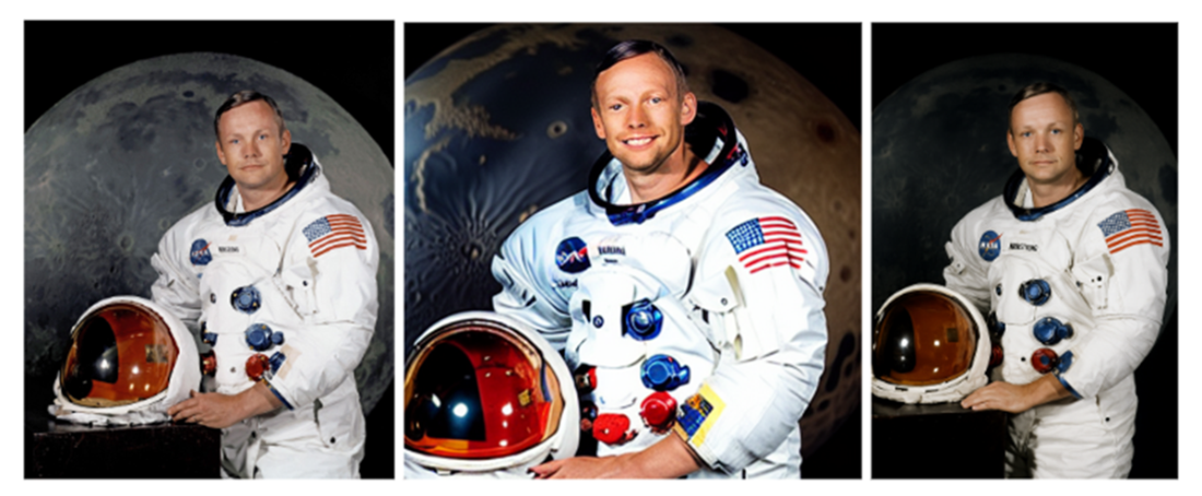 How models link names to real images. Left: NASA public-domain portrait of Neil Armstrong. Middle: Stable Diffusion v1.5 output for the prompt “Neil Armstrong”. Right: ChatGPT-5 generated output for the same prompt[26]