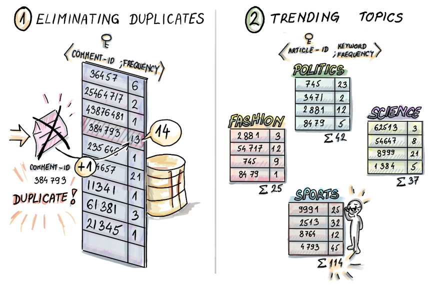 : In this example, we build a (comment-id, frequency) hash table to help us store distinct comment-id’s with their frequency count. An incoming comment-id 384793 is already contained in the table, and its frequency count is only incremented. We also build topic-related hash tables, where, for each article we count the number of times associated keywords appeared in its comments (e.g., in the sports theme, keywords might be: soccer, player, goal, etc). For a large dataset of 3 billion comments, these data structures may require dozens to a hundred of gigabytes of RAM memory.