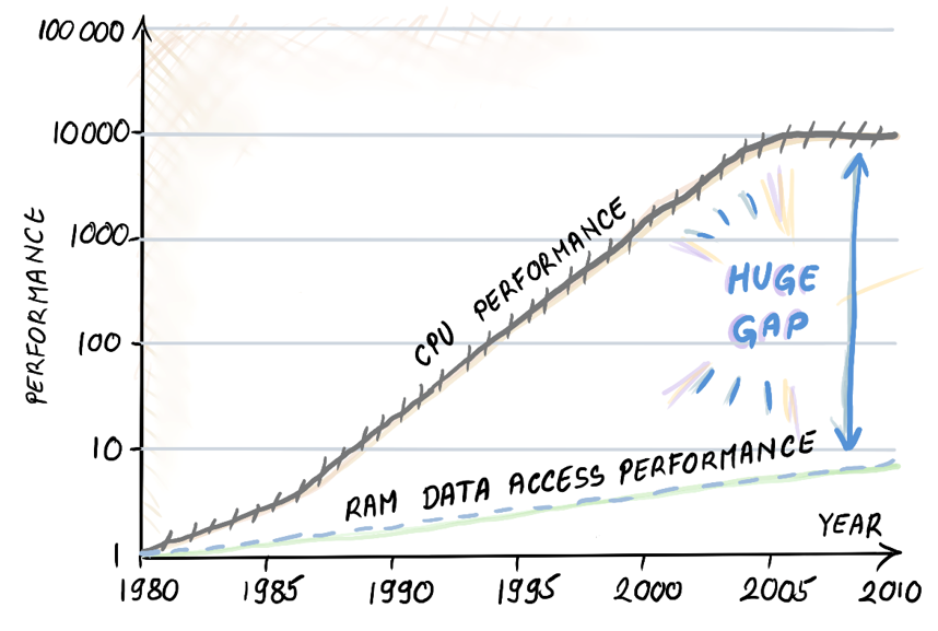 : CPU-Memory Performance Gap graph, adopted from Hennessy & Patterson’s Computer Architecture. The graph shows the widening gap between the speeds of memory accesses to CPU and RAM main memory (the average number of memory accesses per second over time.) The vertical axis is on the log scale. Processors show the improvement of about 1.5x per year up to year 2005, while the improvement of access to main memory has been only about 1.1x per year. Processor speed-up has somewhat flattened since 2005, but this is being alleviated by using multiple cores and parallelism.