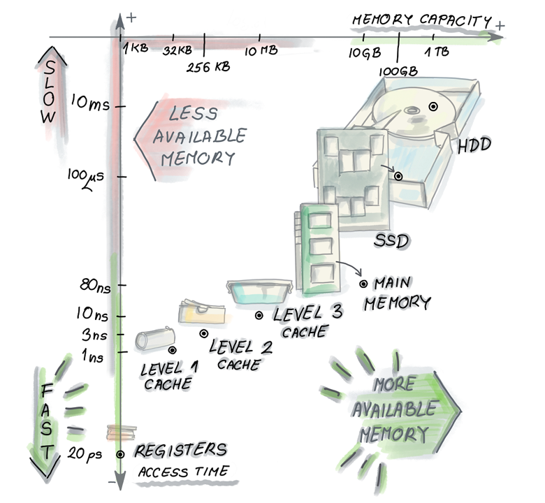 : Different types of memories in the computer. Starting from registers in the bottom left corner, that are blindingly fast but also very small, we move up (getting slower) and right (getting larger) with Level 1 cache, Level 2 cache, Level 3 cache, main memory, all the way to SSD and/or HDD. Mixing up different memories in the same computer allows for the illusion of having both the speed and the storage capacity, by having each level serve as a cache for the next larger one.