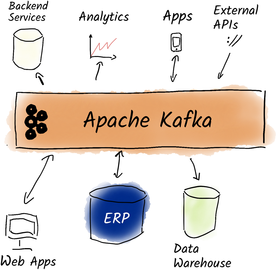 Kafka as the central nervous system for data in a company. Every event that takes place in the enterprise is stored in Kafka. Other services can react to these events asynchronously and process them further.