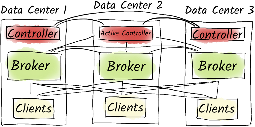In a stretched cluster, our Kafka brokers are distributed among multiple data centers.