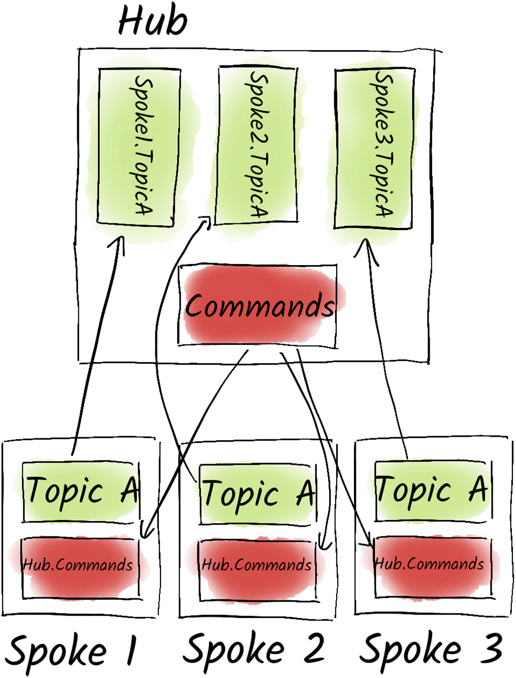 A Hub-and-Spoke Topology which uses MirrorMaker 2 (Kafka Connect) to replicate topics from the spokes to the hub. And replicating the commands topic from the hub to the spokes.