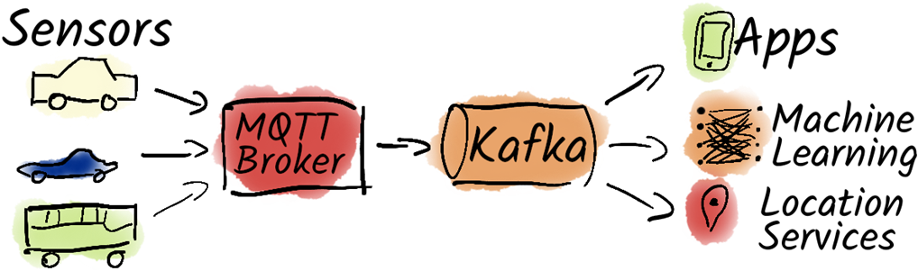 Kafka as an interface between Message Queuing Telemetry Transport (MQTT) and other applications.