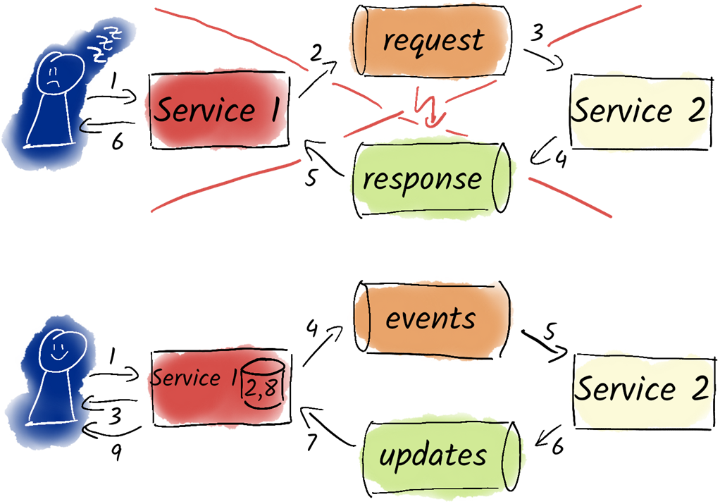 Do not use Kafka for synchronous request-response communication. Instead, notify users about asynchronous processes and confirm the process when it is done.