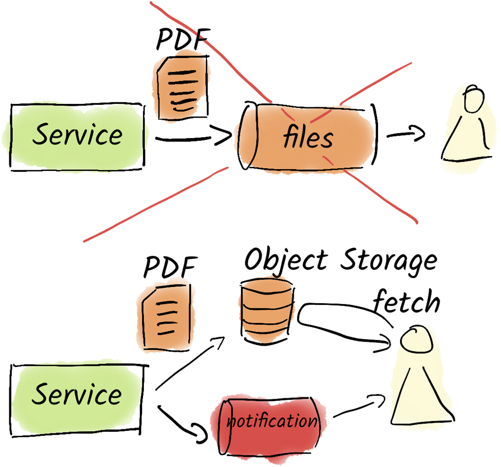 - Not a file exchange platform: store files in object storage; send references or split large payloads into events.
