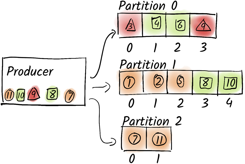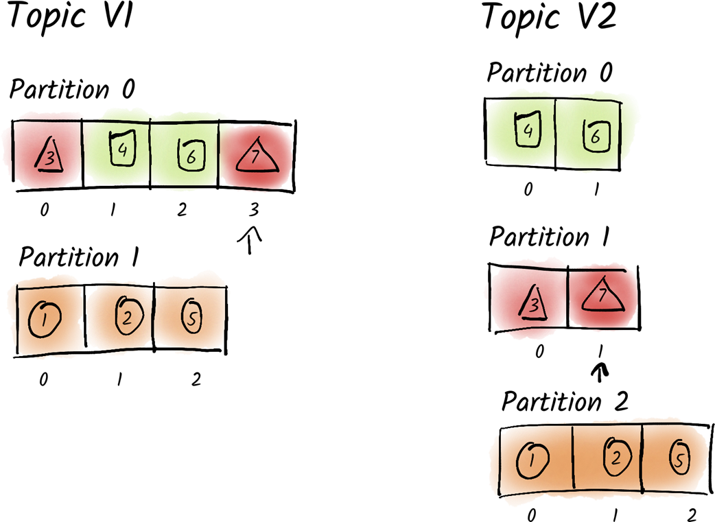 The message 7 with the key triangle was previously stored at offset 3 of partition 0. After creating a new topic with three partitions and migrating the data, this message is now stored at offset 1 of partition 1.
