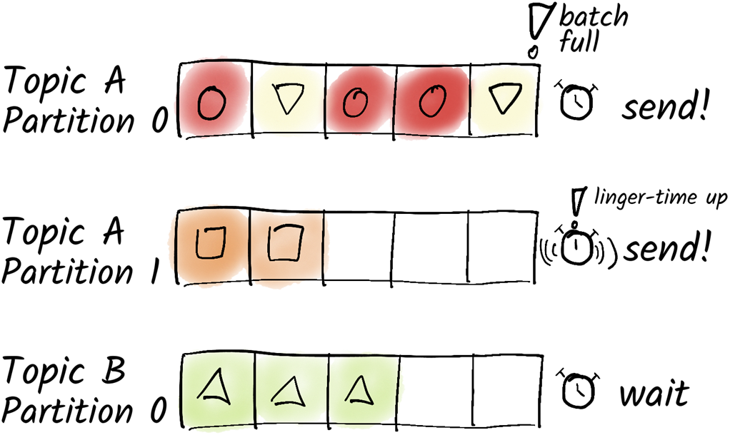 The producer batches messages for each topic and partition. A message is sent as soon as either the batch is full or the linger time is up.