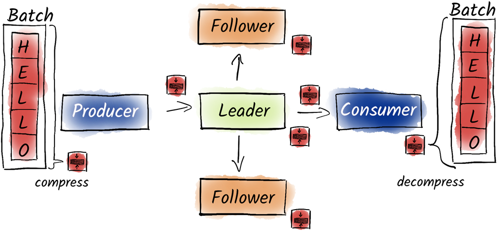 - Producers can compress batches to reduce the required bandwidth but this might increase latency.