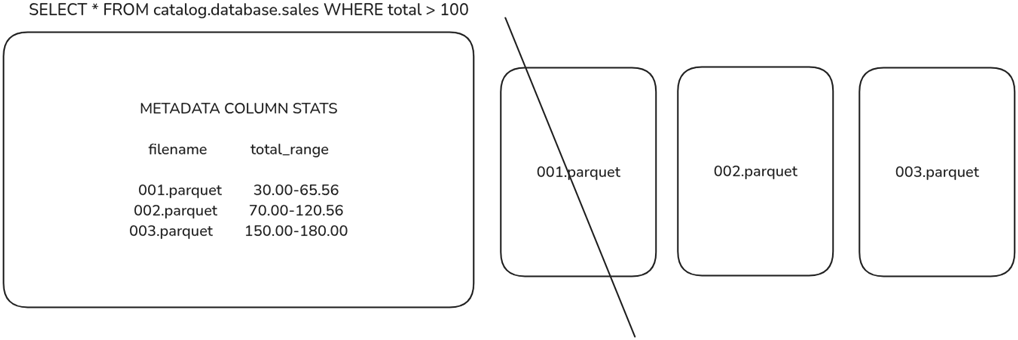 Engines use metadata statistics to eliminate data files from being scanned for faster queries.