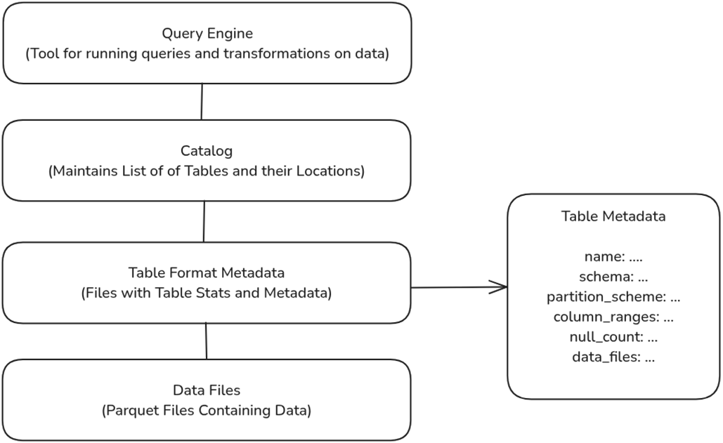 - Catalog layer: Tracks tables and metadata (e.g., AWS Glue, Project Nessie, Apache Polaris, Gravitino, Lakekeeper, Iceberg REST Catalog)