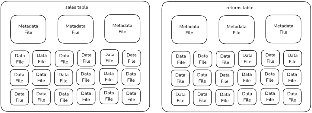 - metadata.json (table-level): schemas, partitioning, snapshots