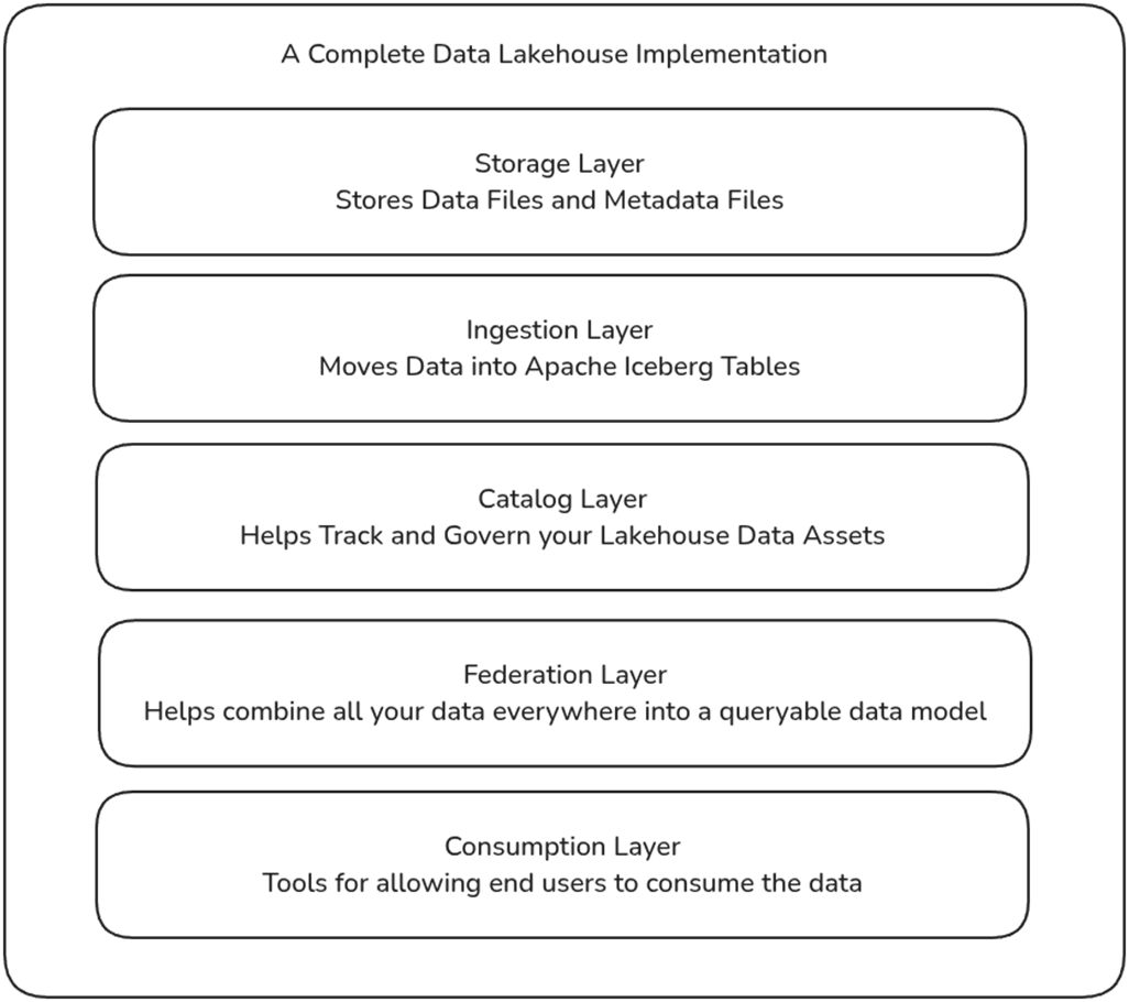 - The Apache Iceberg Lakehouse has five key components: storage, ingestion, catalog, federation, and consumption.