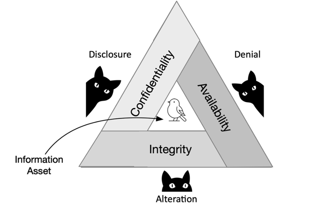 Illustration of the interdependence of the key information security principles of confidentiality, integrity, and availability along with the corresponding threats of disclosure, alteration, and denial.
