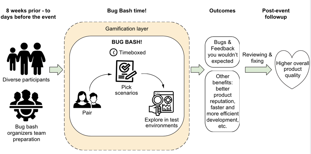 The anatomy of a bug bash. On the left, you see what comes into the bug bash; in the middle, the event itself and its aspects; and on the right, the event's outcomes. All this leads to a better quality product.