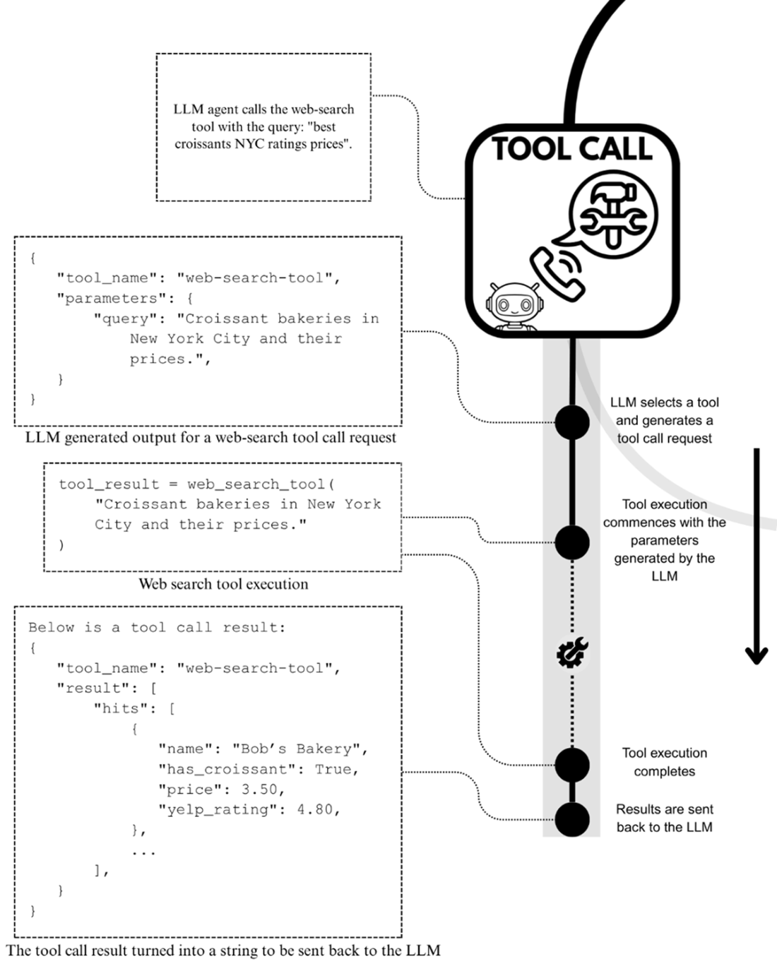 A UML sequence diagram that illustrates how the flow of a tool call. First, an LLM agent prepares a ToolCall object and invokes the BaseTool, which initiates the processing of the tool call. Once completed, the BaseTool class constructs a ToolCallResult which then gets sent back to the LLM agent.