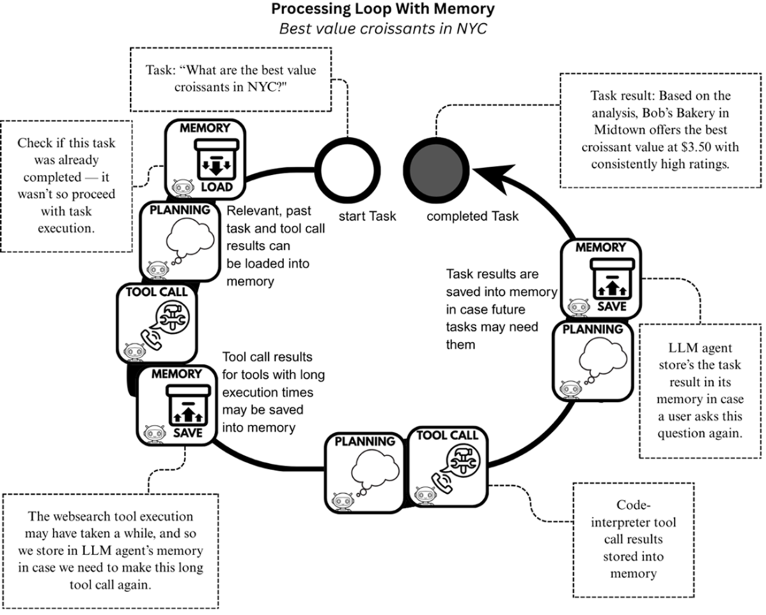 A mental model of the LLM agent processing loop that has memory modules for saving and loading important information obtained during task execution.