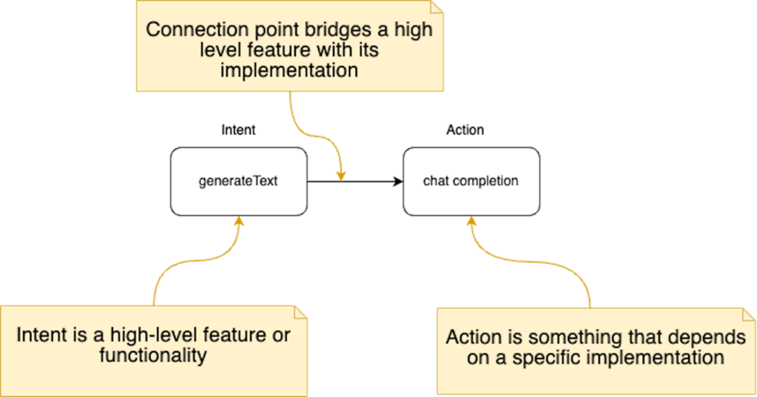 Separation of concerns between intents and actions. The intent (left) represents the high-level feature or functionality, such as "generateText". The action (right) represents the specific implementation or concrete steps to fulfill the intent, such as making a "chatCompletion" request. The arrow signifies the connection point that bridges the intent with its corresponding action, facilitating communication and interaction between the two components.