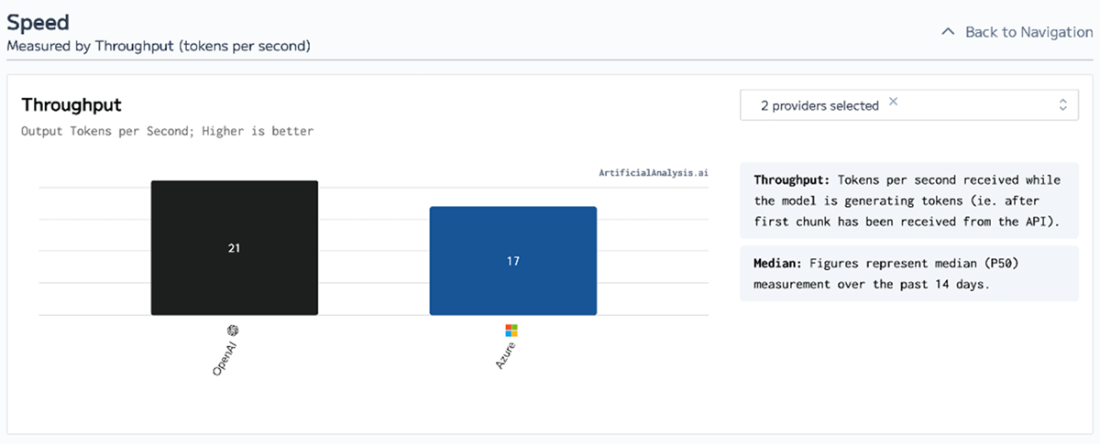 Speed comparison of gpt-4 models served from OpenAI vs Azure. The output token throughput are merely within a couple of dozen tokens per second maximum. Source https://artificialanalysis.ai.