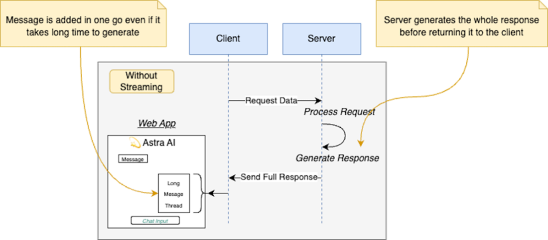 Without streaming the client sends a request and waits for the server to generate and send the full response before displaying it.