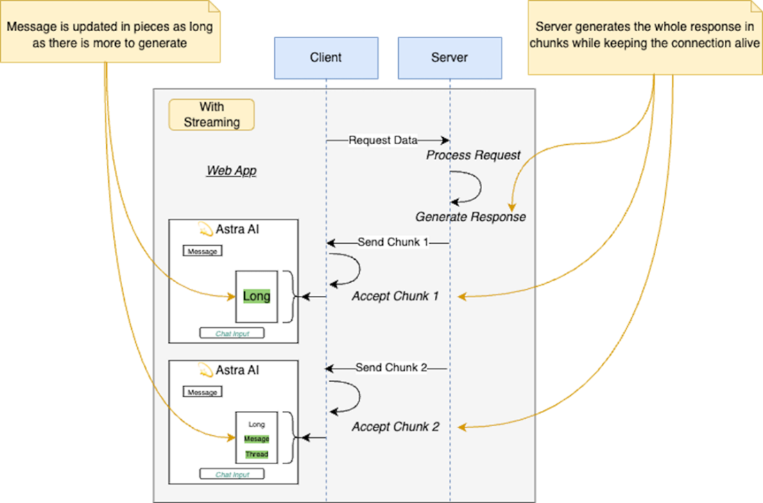With streaming the client sends a request and the server sends the response in small chunks that are being streamed back to the client for processing.