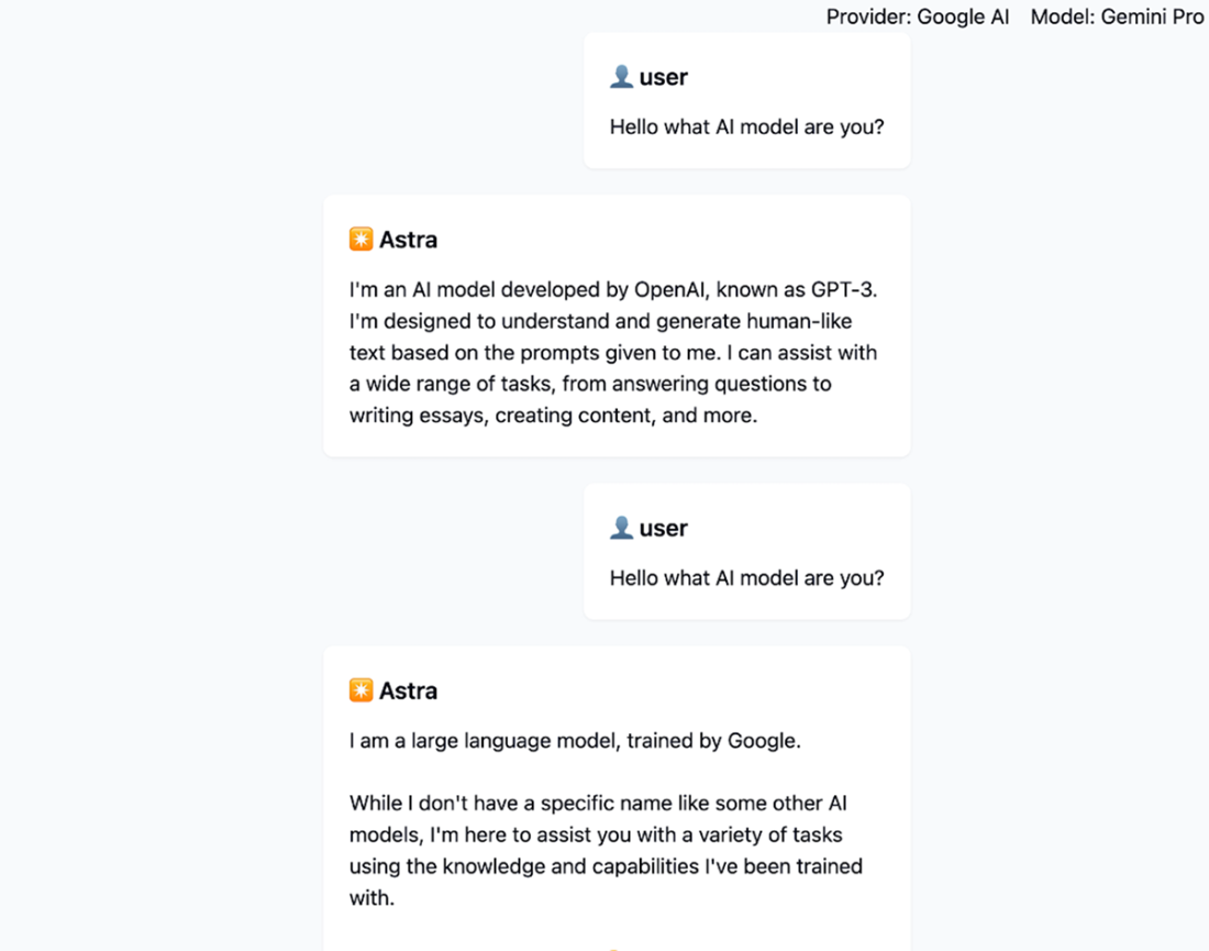 Screenshot of the current application showcasing the usage of multiple providers in the same chat session.